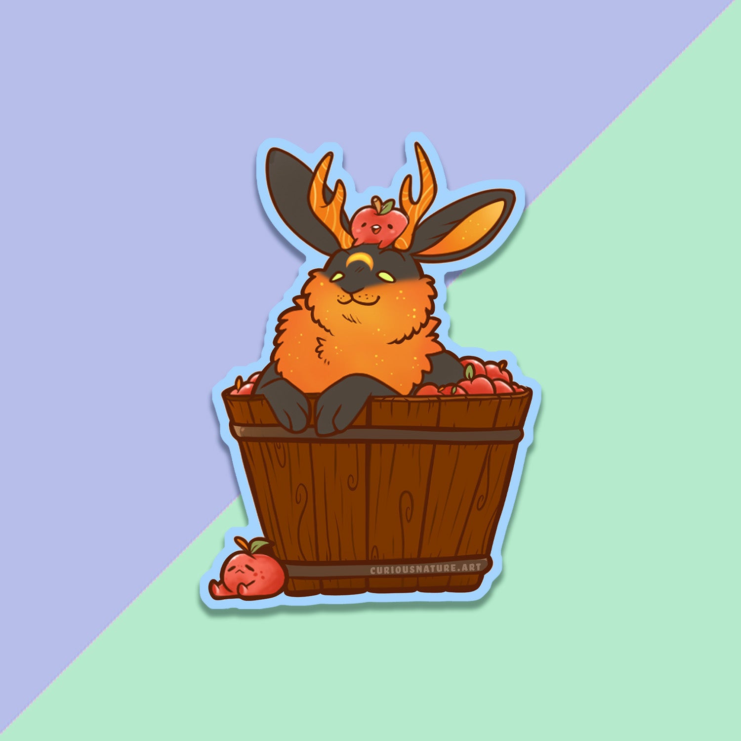 An adorable Harvest Moon Jackalope trying to blend in with a barrel of apples!